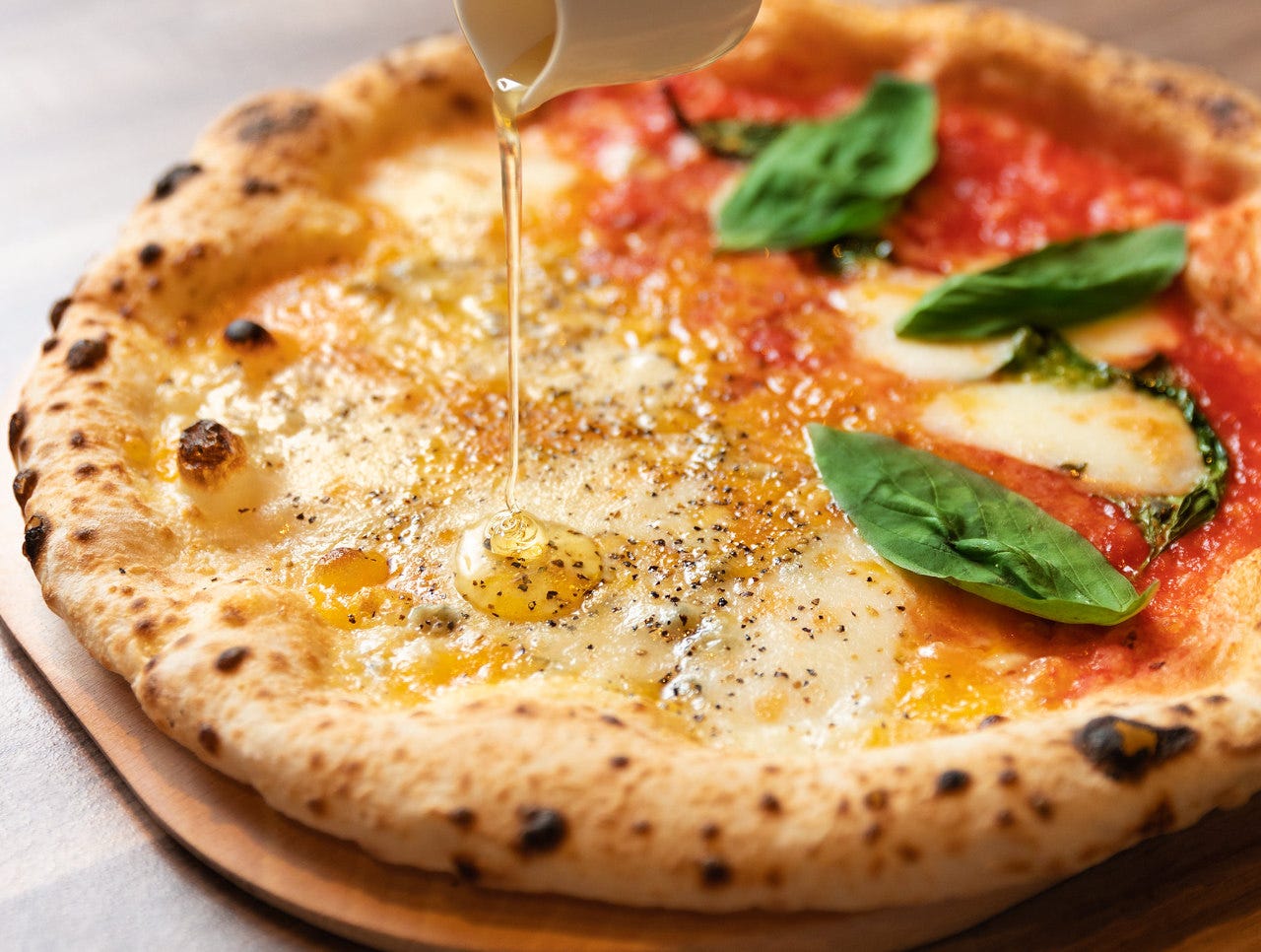 【モチモチした耳と薄い生地が特徴的なピザ!】文字通りナポリのピザという意味。この名称は和製イタリア語で、イタリア語では 「ピッツァ・ナポレターナ」の呼び方が用いられる。本場ナポリでは、伝統的なピザの材料や製造方法が「真のナポリピッツァ協会」と「ナポリピッツァ職人協会」の機関により定められている。